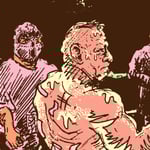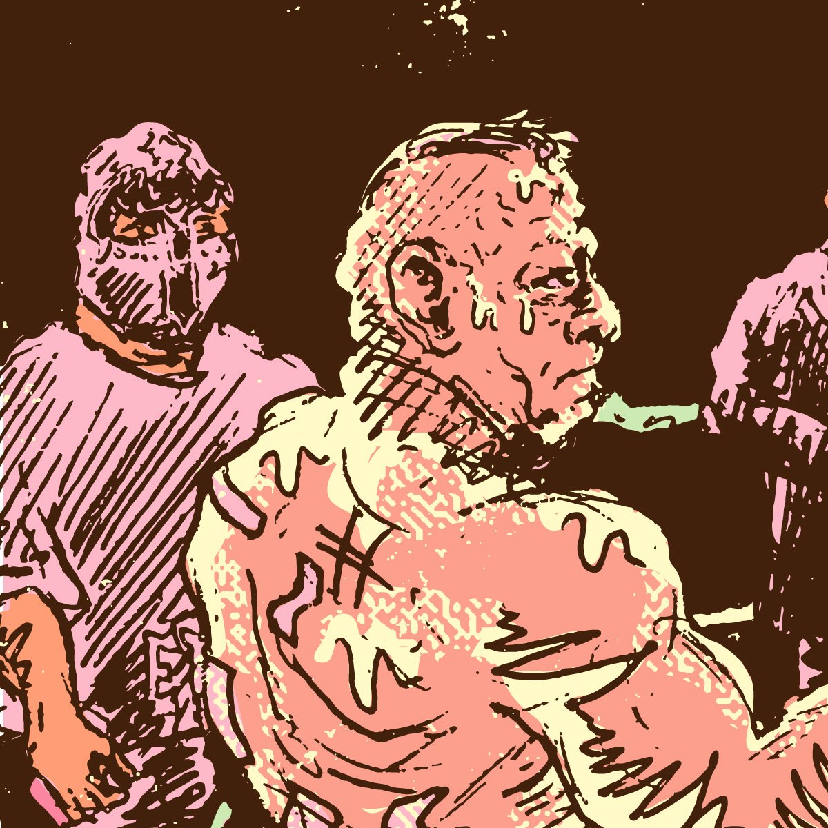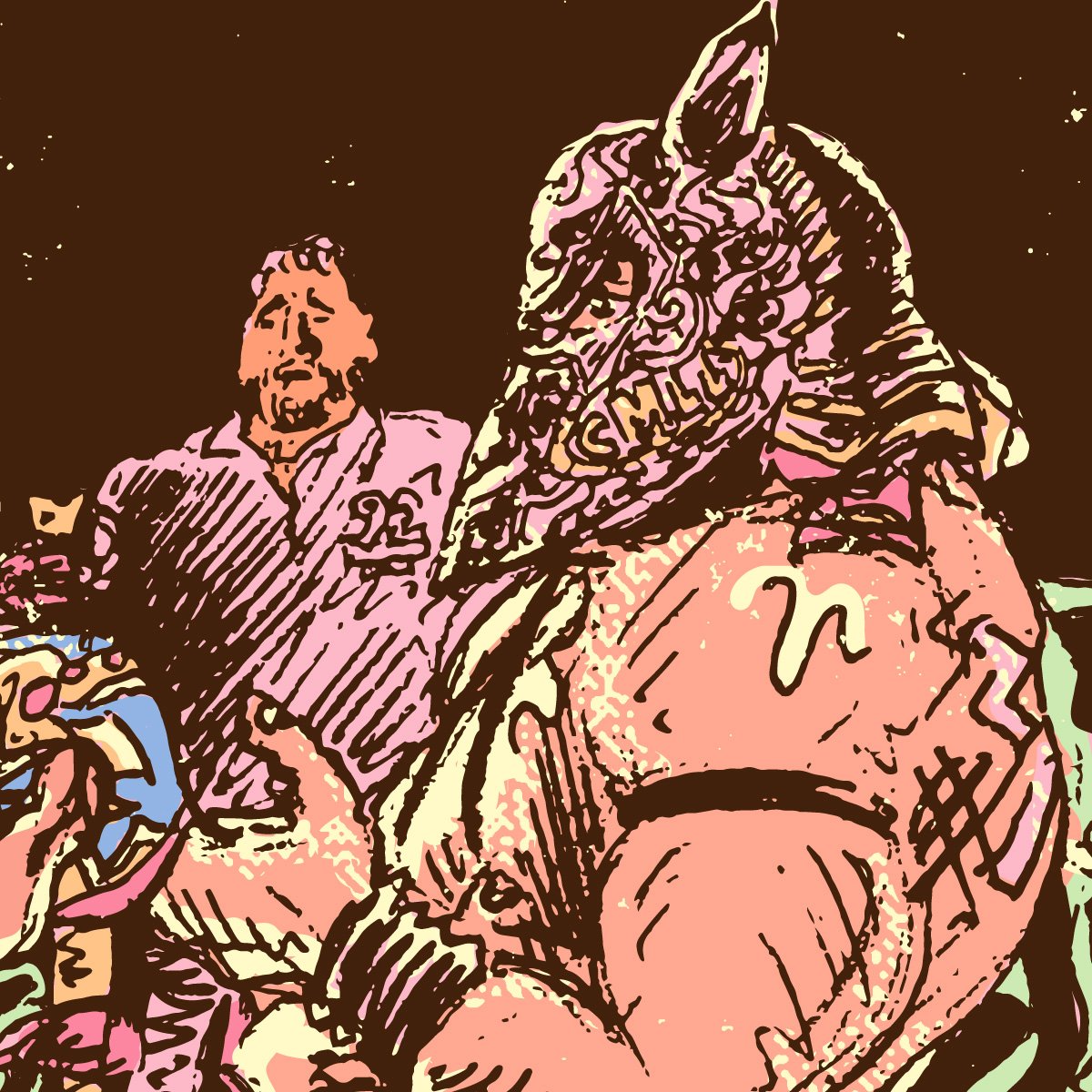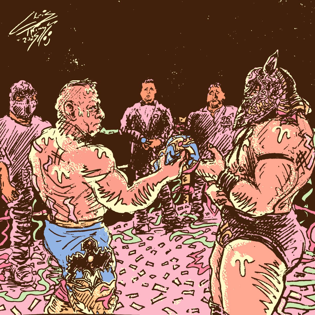 "M.O.T.W. #104: CMLL 92nd Aniversario Eliminatorio De Parejas Increibles Apuestas (Valiente & Esfinge vs. Ultimo Guerrero & Averno vs. Dragon Rojo Jr. & Barbaro Cavernario)" - ink & digital illustration