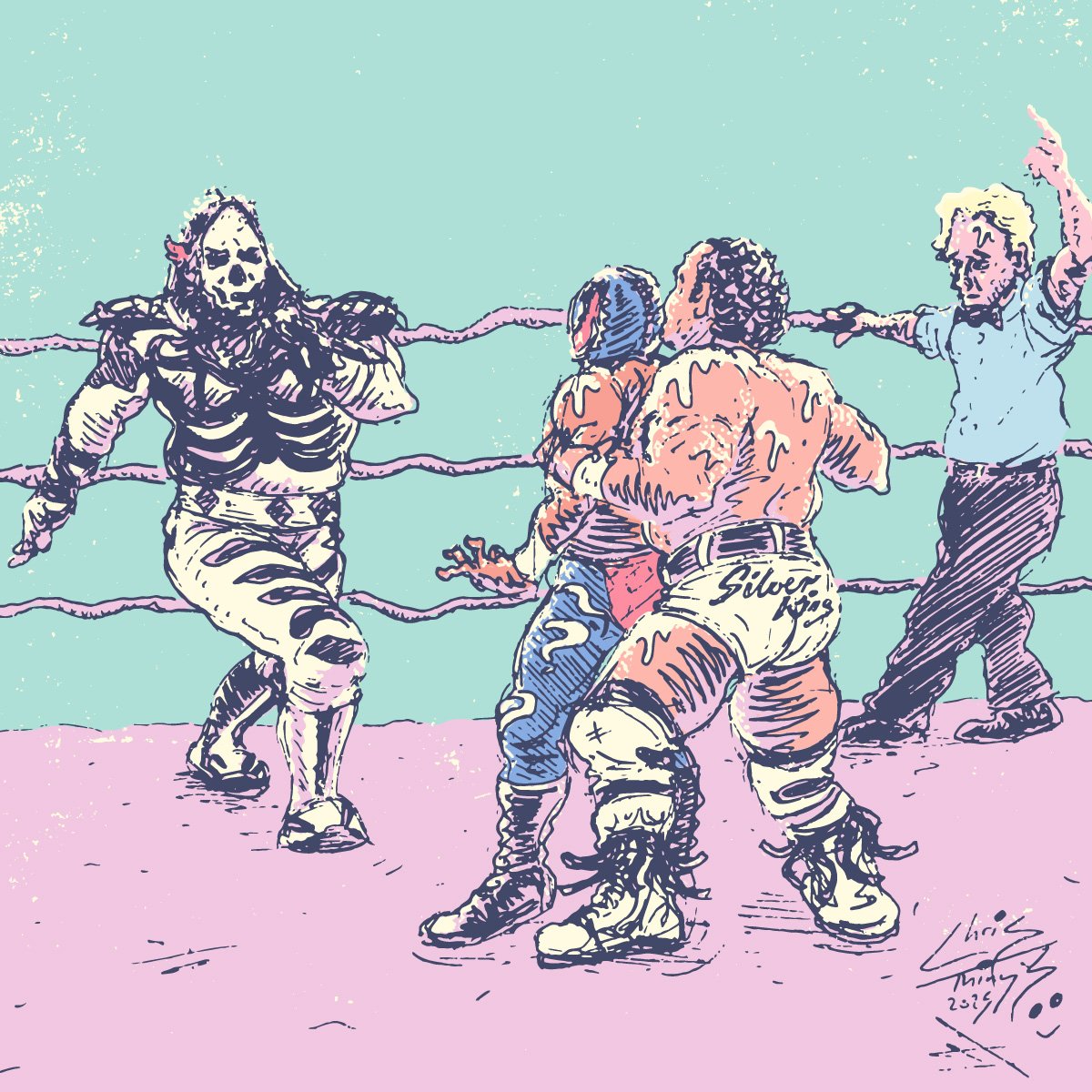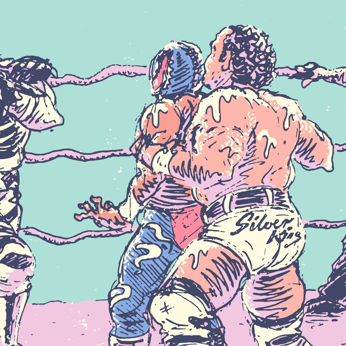 "M.O.T.W. #110: La Parka, Silver King & Psychosis vs. Rey Mysterio Jr., Juventud Guerrera & Hector Garza" - ink & digital illustration