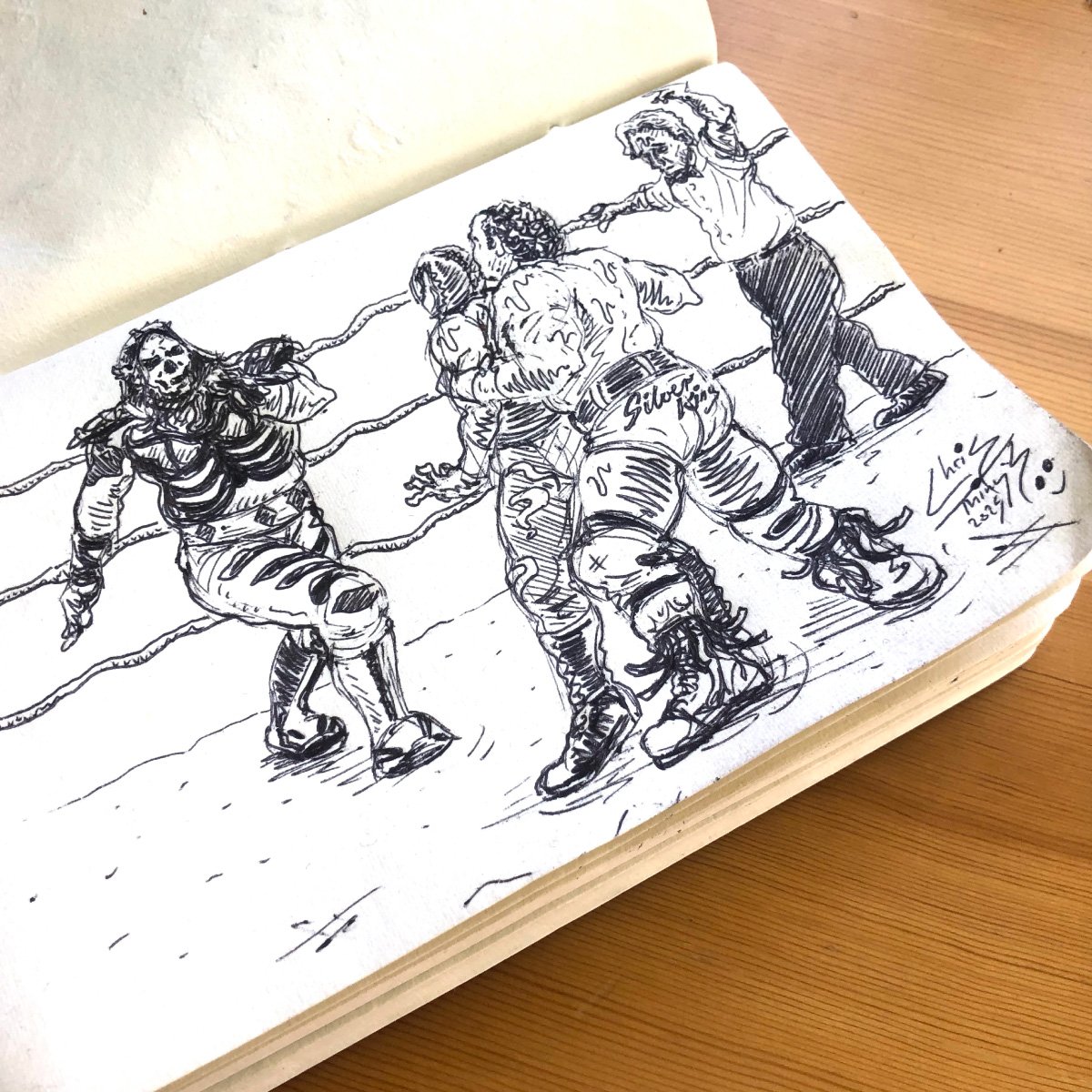 We're up to the 110th edition of our illustration series & this week we travel to 1997 World Championship Wrestling for a classic Monday night Lucha Libre rollercoaster ride! This crazily star-studded trios match took place on December 22nd, 1997, on WCW Monday Nitro at the Macon Coliseum in Macon, GA.