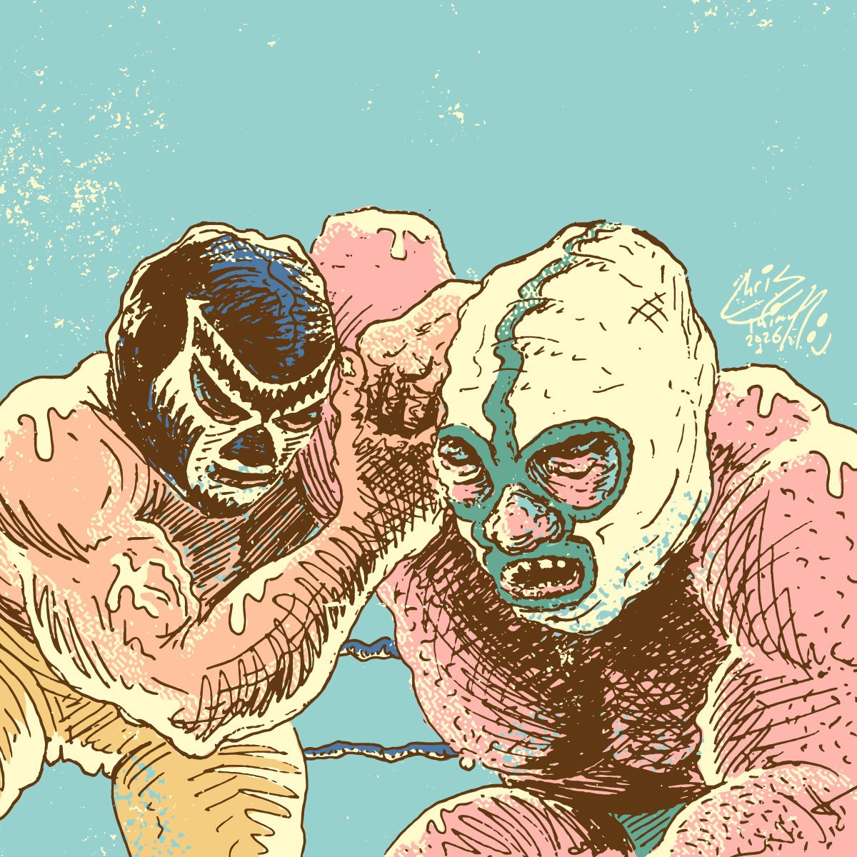 "M.O.T.W. #124: Mil Máscaras vs. The Destroyer" - ink & digital illustration